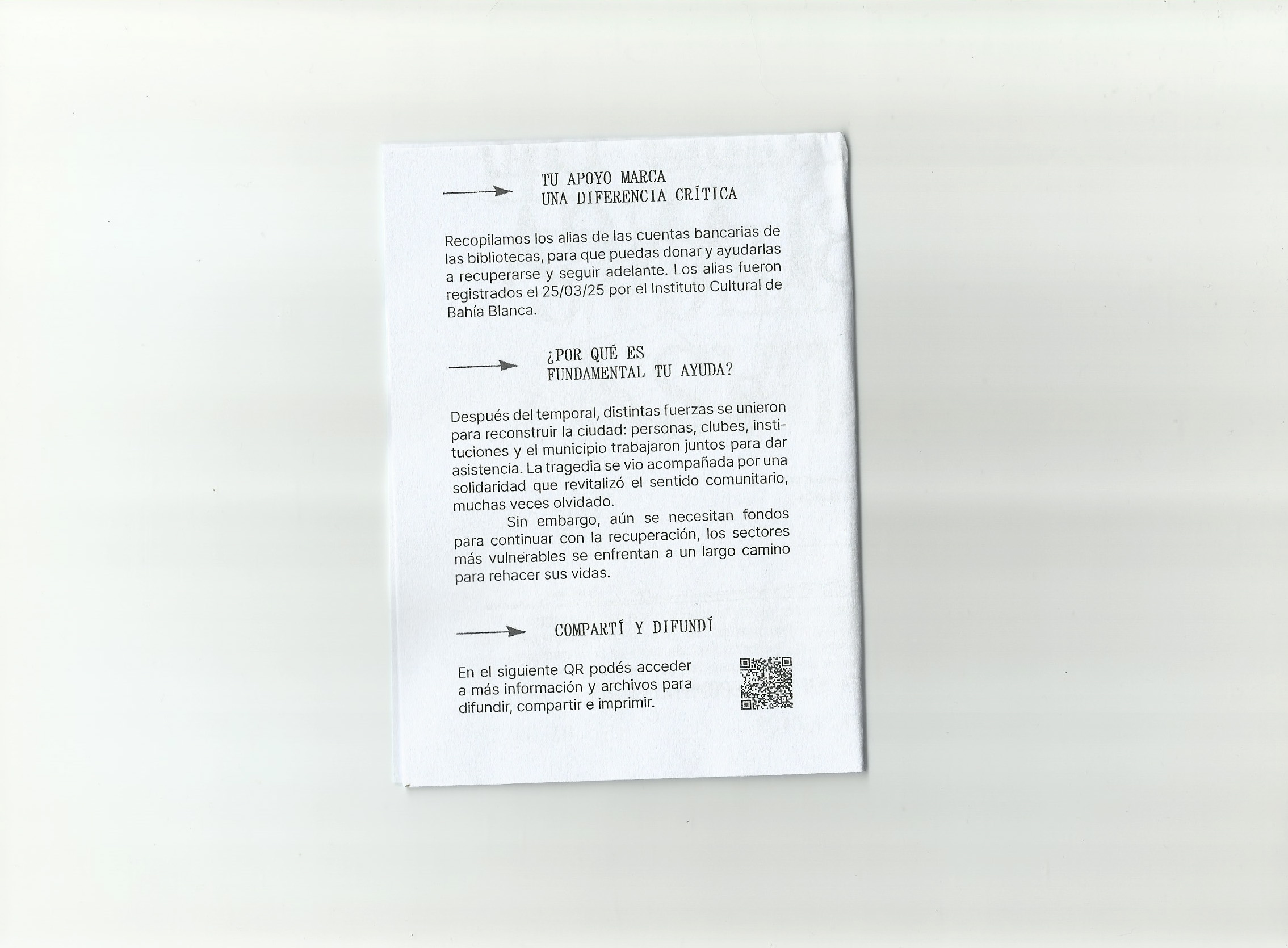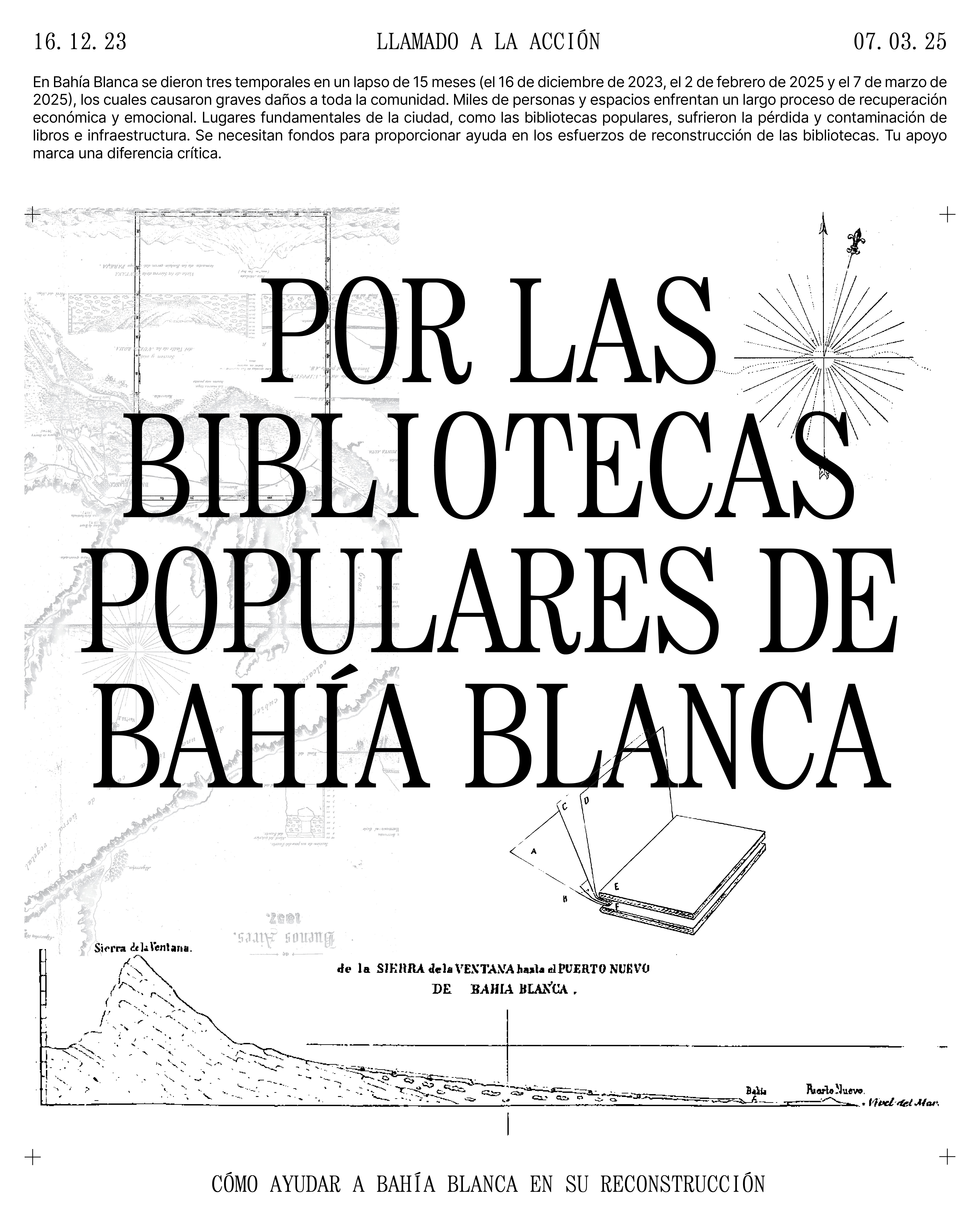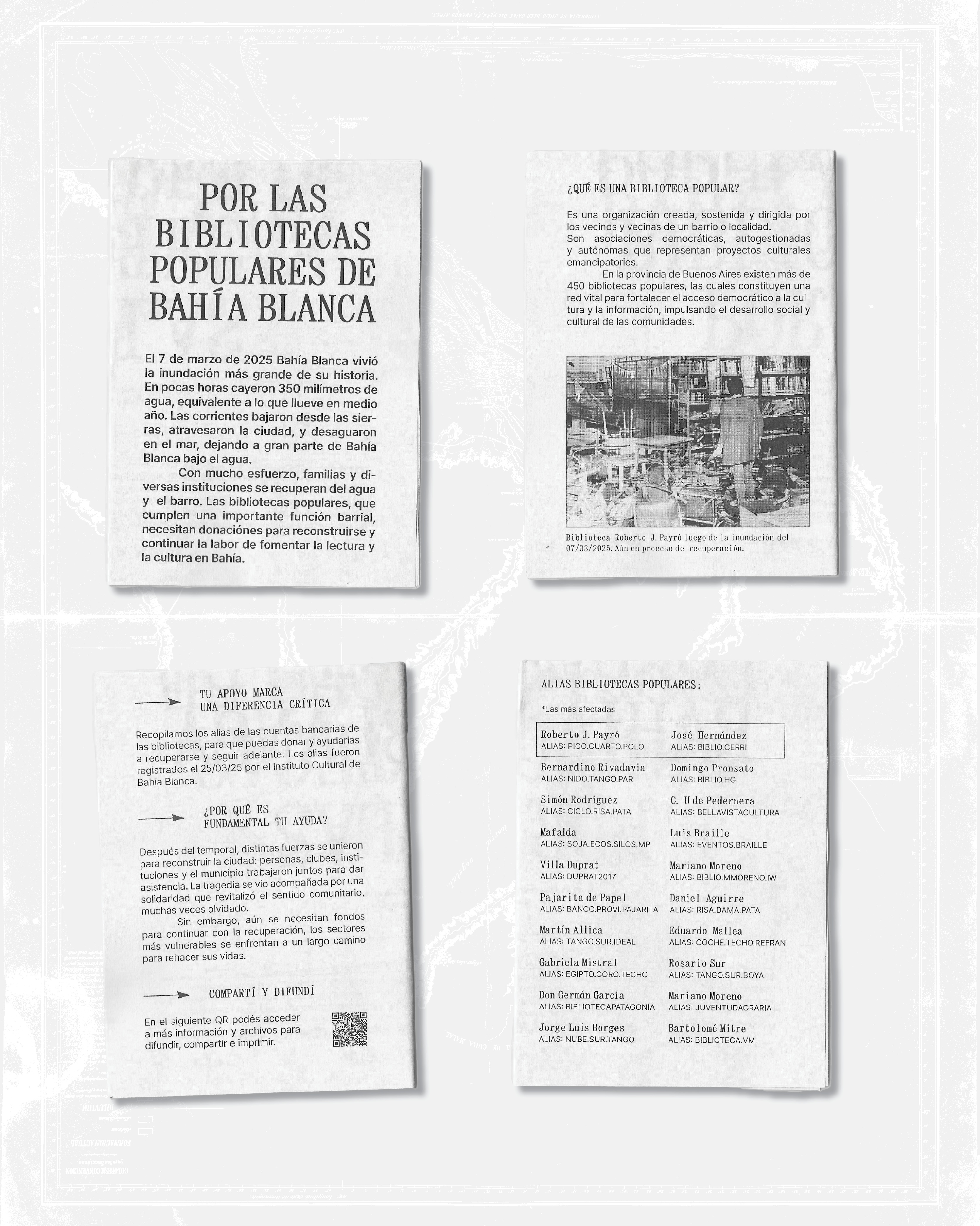 “Por las bibliotecas populares de Bahía Blanca” es una guía que permite dimensionar la situación de las bibliotecas populares tras las catástrofes en Bahía Blanca y canalizar apoyo para su recuperación económica mediante un listado con los alias de cada institución. El material está subido en un Drive en formato de libre acceso para que pueda compartirse e imprimirse colectivamente.