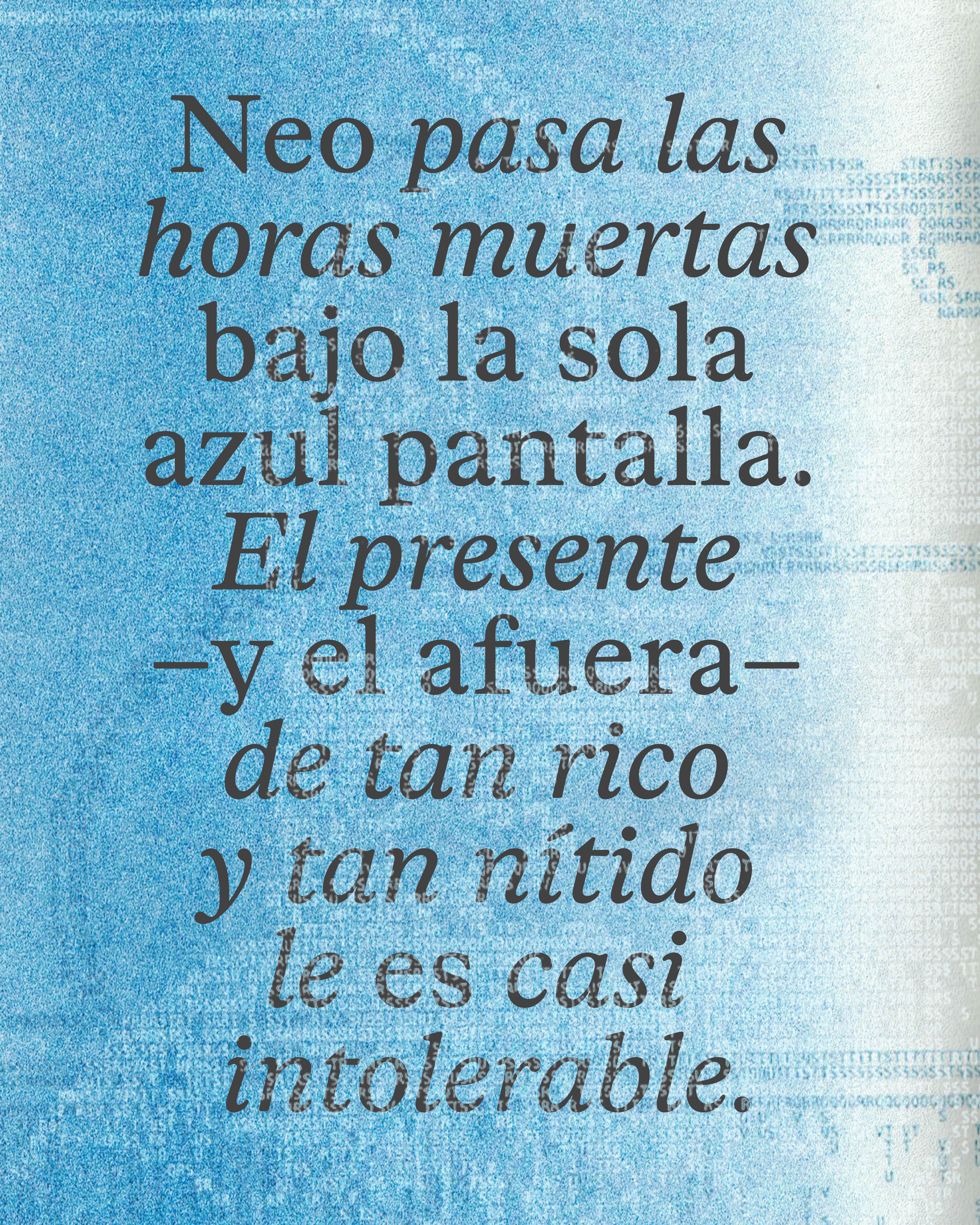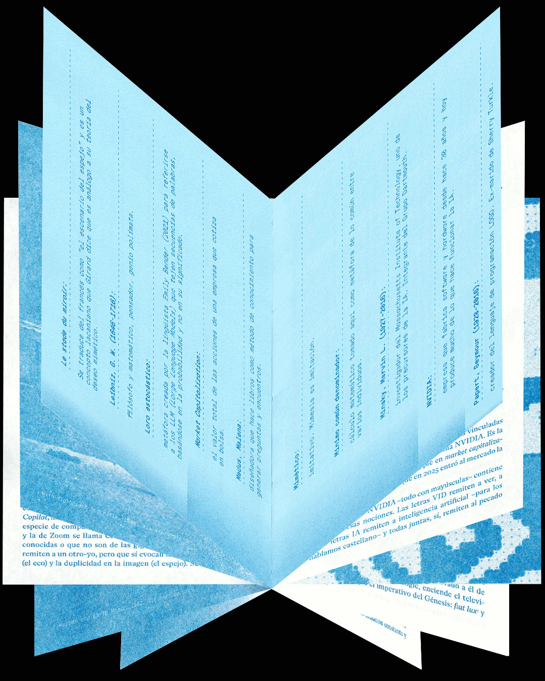 Un fanzine de ensayos filosófico-literarios por Azul Pantalla que indaga sobre los reflejos que habitan en nuestras pantallas, las tensiones de la corporalidad en el mundo virtual y la dispersión como signo de época. Cuatro microensayos y un Glosario Disperso sobre Doppelgängers, deseo mimético e inteligencia artificial.