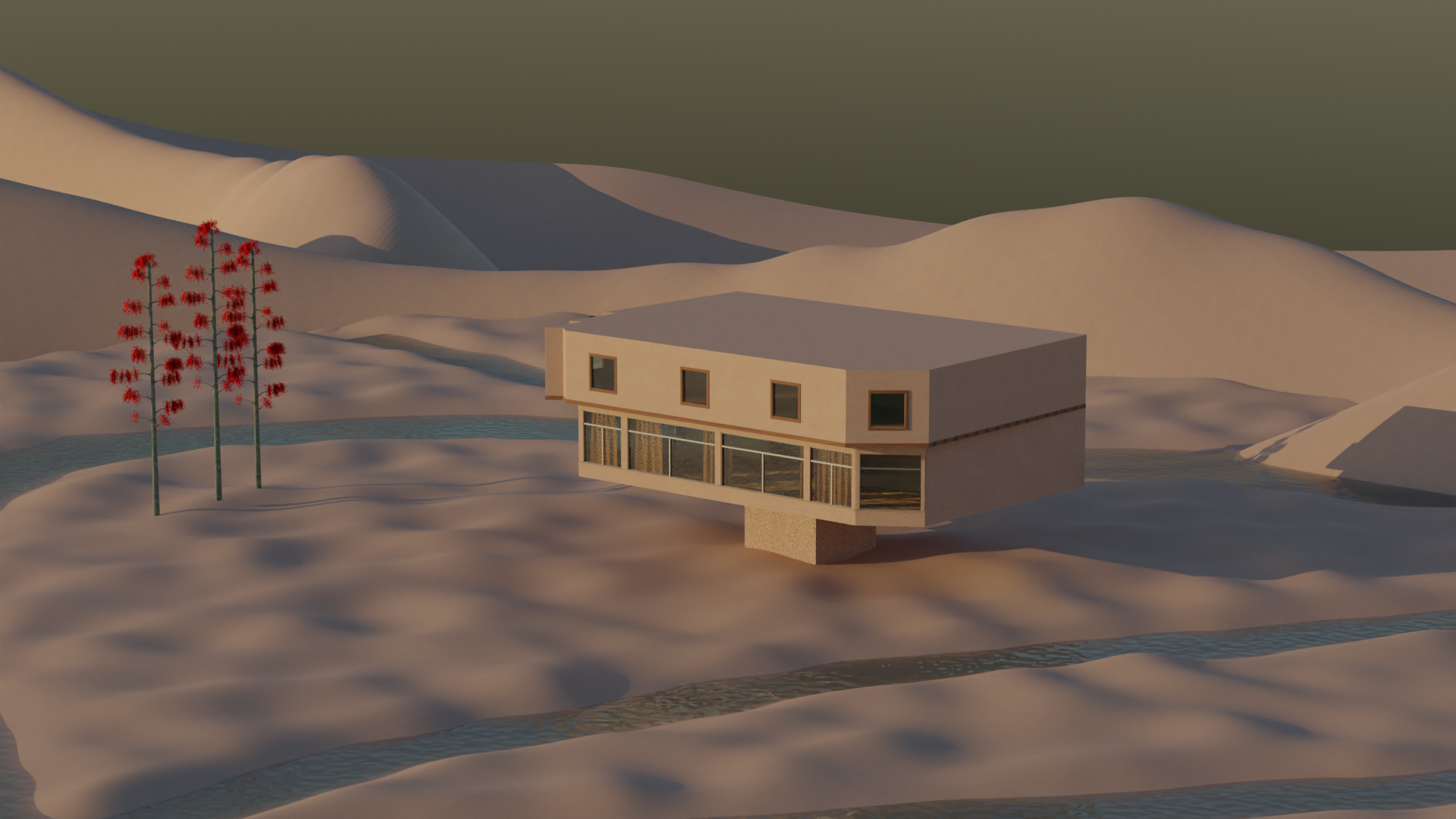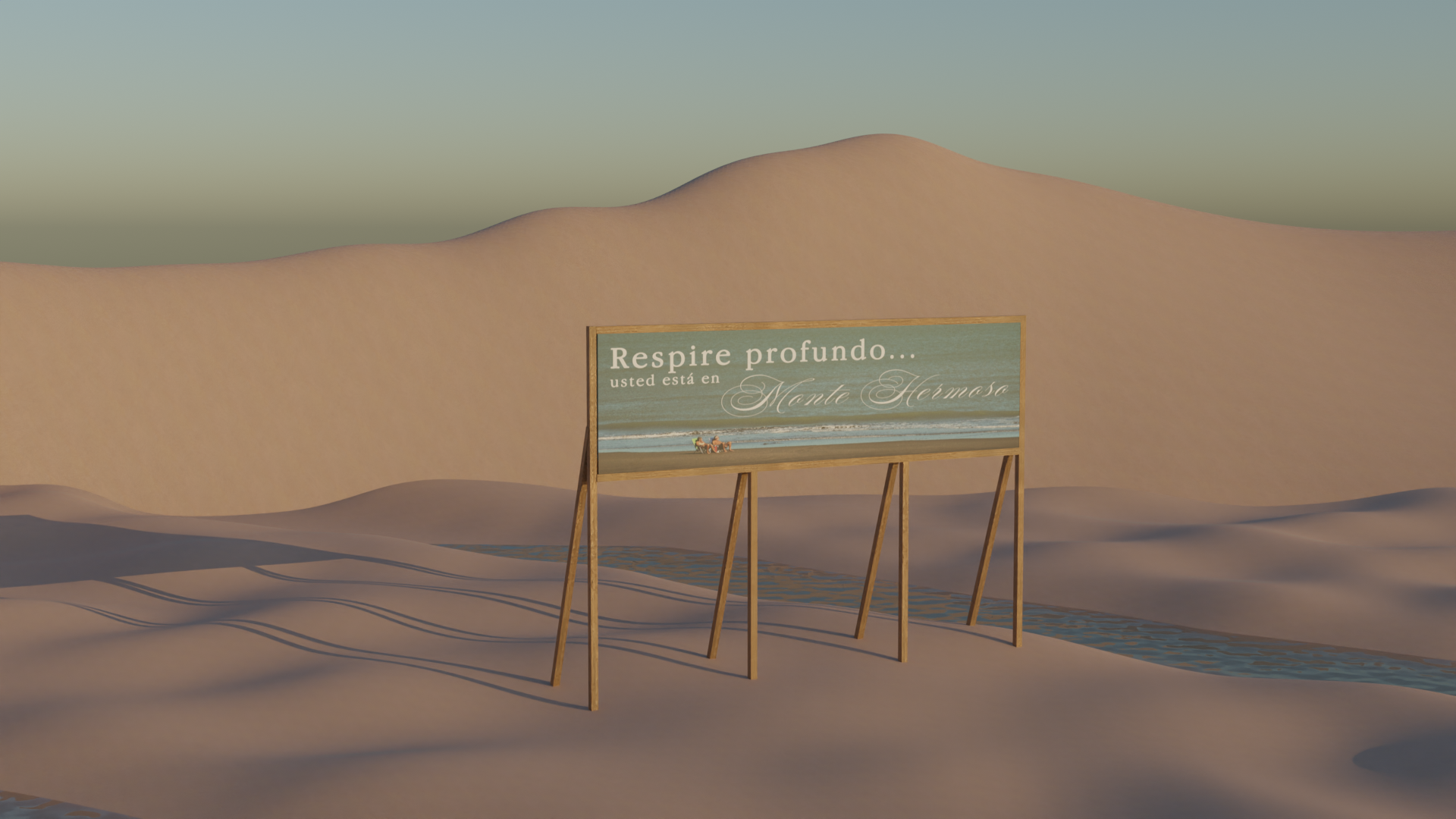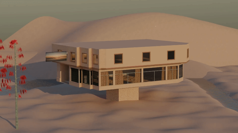 Reconstrucción 3D del Hotel Oikel de la ciudad de Monte Hermoso en un paisaje de médanos remotos y lagunas sin desembocaduras.