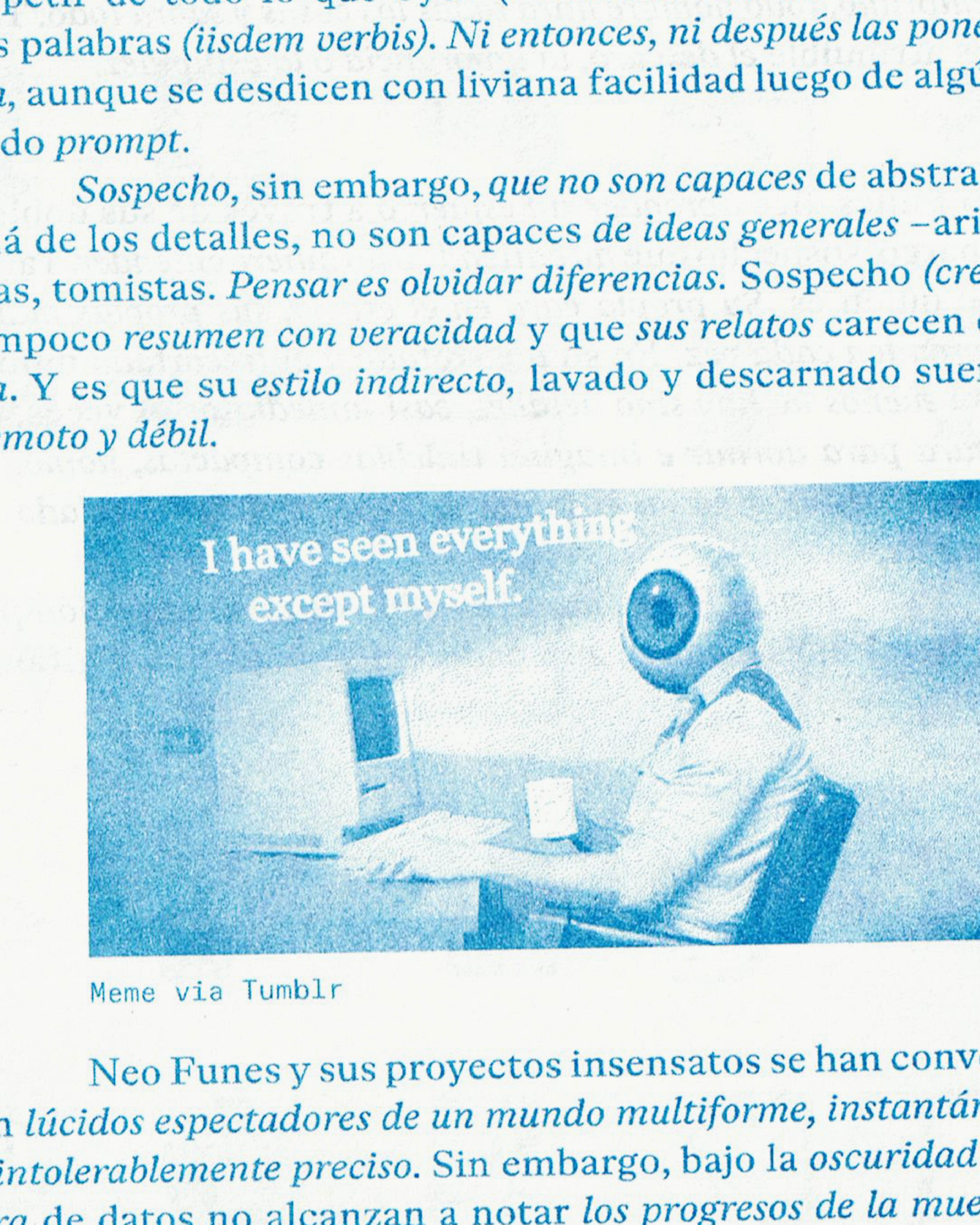 Un fanzine de ensayos filosófico-literarios por Azul Pantalla que indaga sobre los reflejos que habitan en nuestras pantallas, las tensiones de la corporalidad en el mundo virtual y la dispersión como signo de época. Cuatro microensayos y un Glosario Disperso sobre Doppelgängers, deseo mimético e inteligencia artificial.